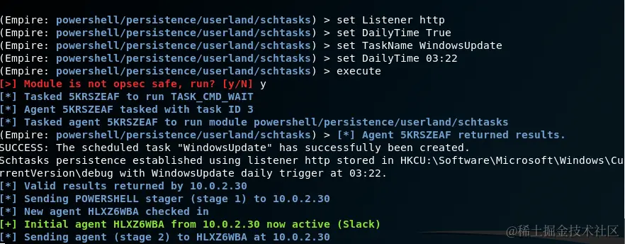 Empire根据活动代理的特权包含两个模块,这些模块可用于实施计划任务的持久性技术。以下配置每天凌晨03:22将执行基于PowerShell的有效负载。有效负载存储在注册表项中,任务名称为“ WindowsUpdate ”,以便区分合法的计划任务。