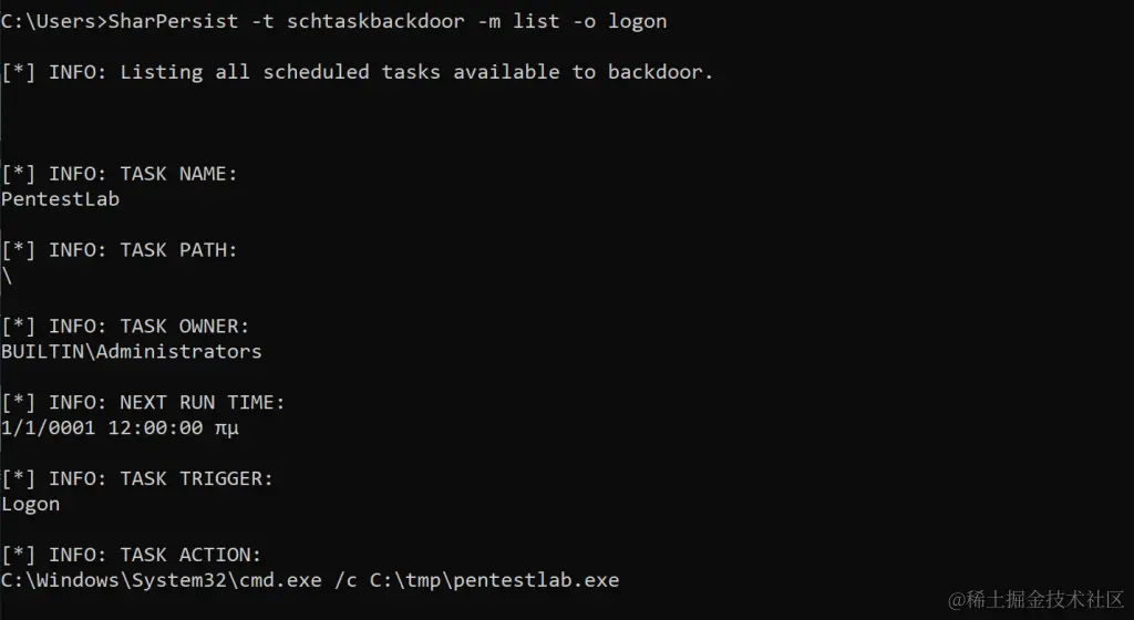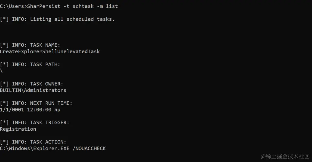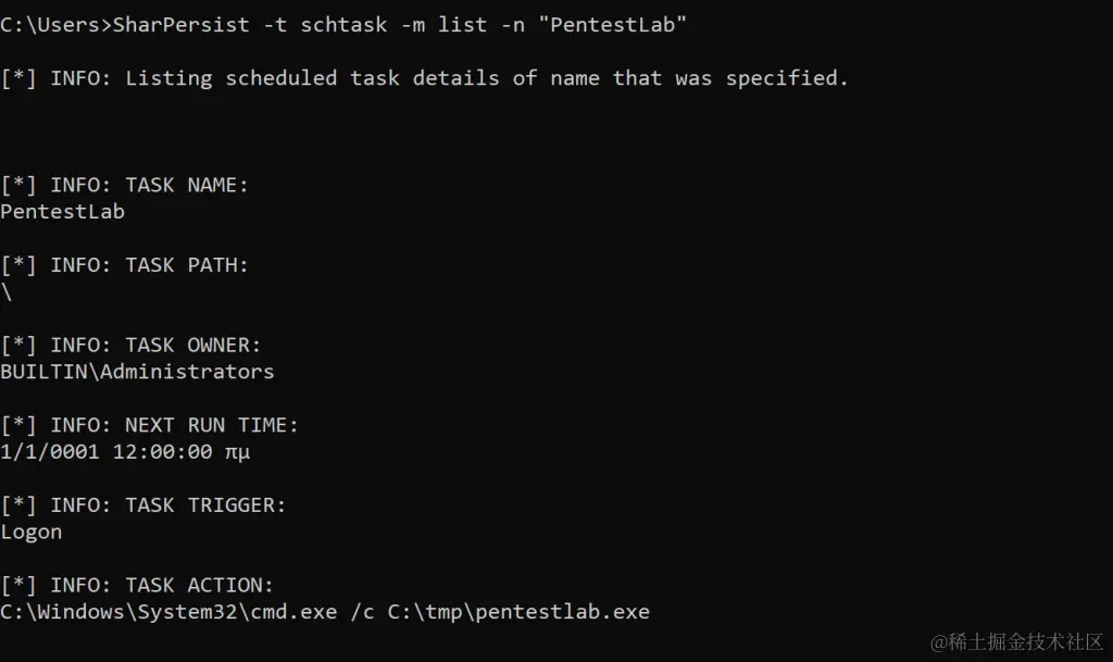 SharPersist也可用于列出特定的计划任务,以识别所有者,触发器和要执行的动作。