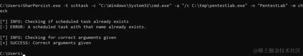 SharPersist.exe -t schtask -c "C:\Windows\System32\cmd.exe" -a "/c C:\tmp\pentestlab.exe" -n "PentestLab" -m check