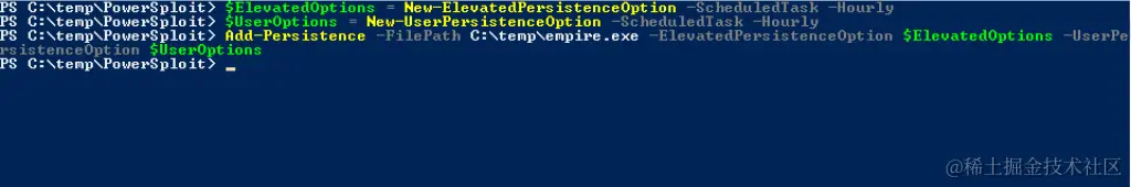 PowerSploit的持久性模块支持各种功能,可用于向脚本或脚本块添加持久性功能。在添加持久性之前,需要配置高架选项和用户选项。