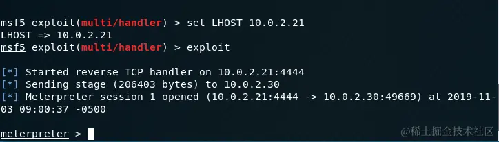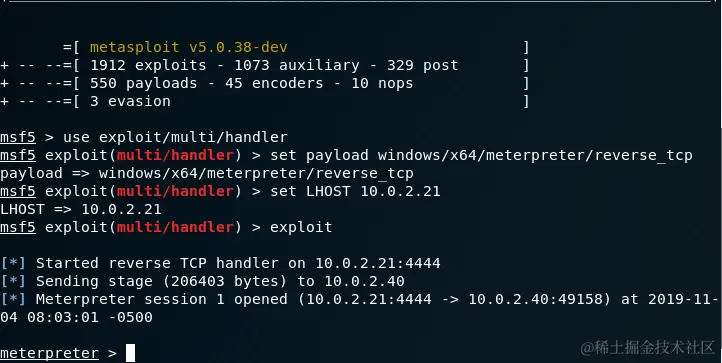 在系统的下一次重新引导中,有效负载将执行,并且Meterpreter会话将打开。