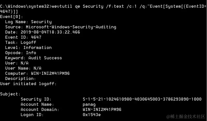 wevtutil qe Security /f:text /c:1 /q:"Event[System[(EventID=4647)]]