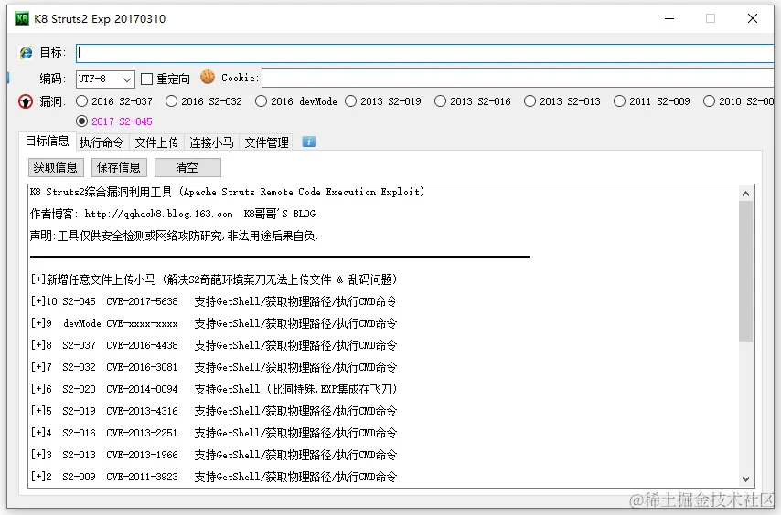 推荐理由:Struts2综合漏洞利用工具,包含收集信息,执行命令、文件上传、连接小马、文件管理等功能。