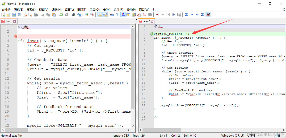 如上图,在上传目录新增了一个evil.php文件,还有一个被篡改的文件是low.php。使用常见的编辑器NotePad++进行对比,可以发现low.php文件里被插入了一句话webshell。