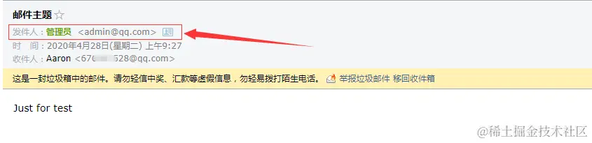 在SPF配置有效的情况下,Sender必须通过SPF检验,所以我们可以设置为正常的邮件服务器地址,然后对From字段进行伪造。