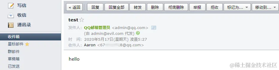 QQ邮箱网页版查看邮件,Sender和From字段不一样时,发件人的位置显示由admin@evil.com代发。