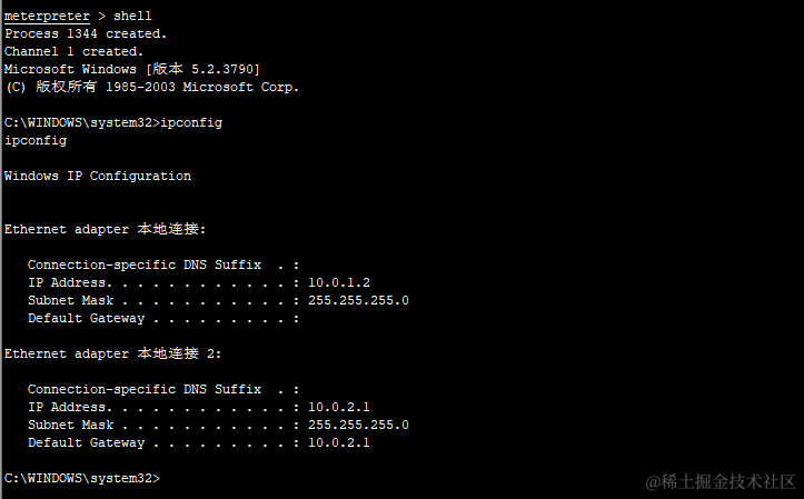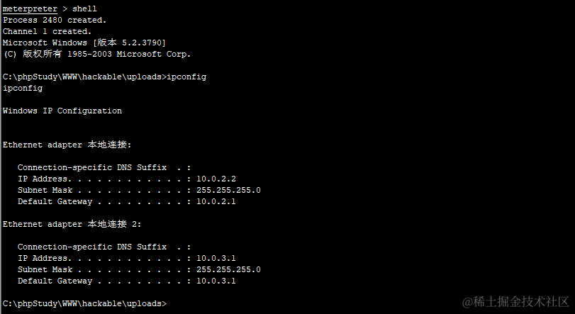 首先,我们通过Web入侵获得Server1权限,并通过横向渗透到Server2,探测到Server2存在双网卡。在这里,我们以Server2作为攻击跳板机继续入侵。