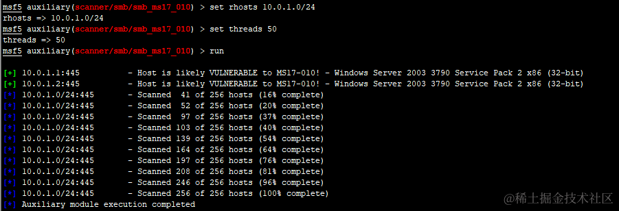 3、扫描内网主机,使用msf下的扫描模块对IP段进行扫描看是否存来MS17-010漏洞。