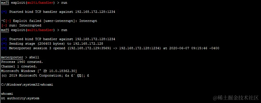 4、启动msf监听本地端口(PS:监听端口如果一直收不到shell,可重新运行一次。)