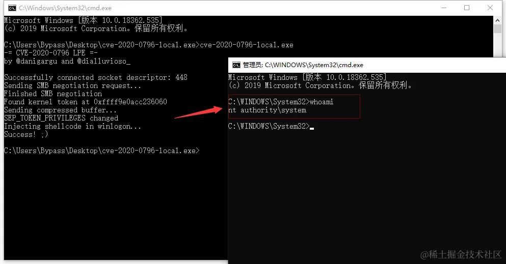 本地普通用户Bypass执行提权exp后弹出cmd窗口,成功获取system权限。