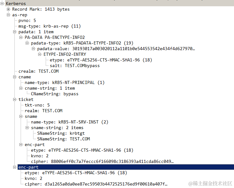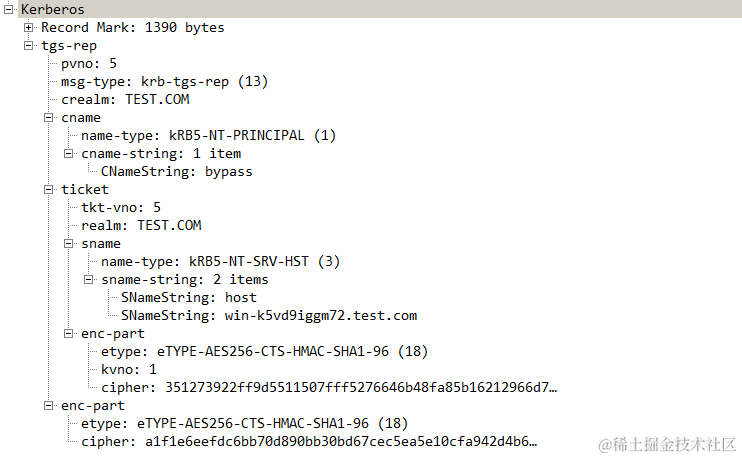 enc-part:使用用户hash加密,包含会话密钥/TGT到期时间和随机数(防重放).
