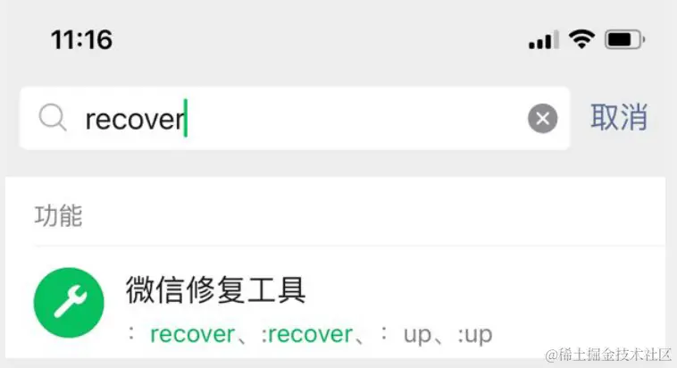 在微信搜索框输入recover,并点击搜索,找到微信修复工具。