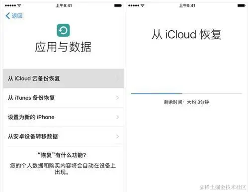 抹除所有内容和设置后,手机会自动重启,自动进入“应用与数据”界面,此时我们选择“从iCloud云备份恢复”选项,登录Apple ID,静等恢复过程完成即可。