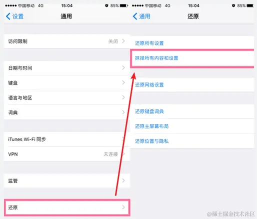 如果想要从iCloud恢复手机数据,首先要抹除当前手机上的所有数据。操作步骤:进入“设置”→“通用”→“还原”界面,点击【抹除所有内容和设置】。