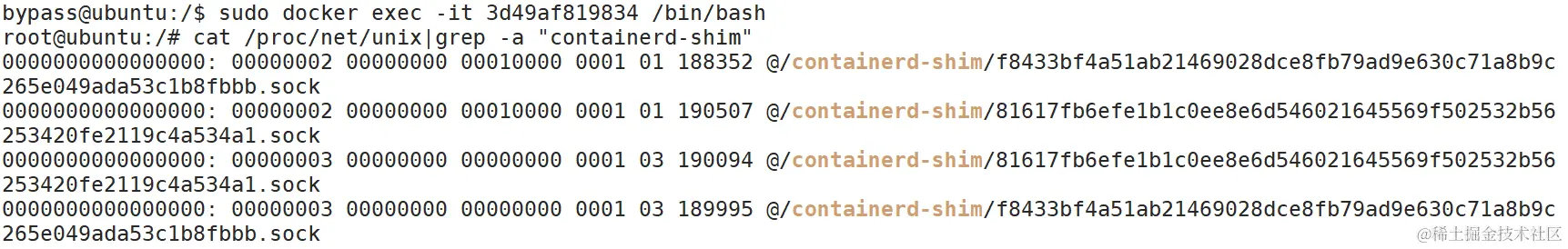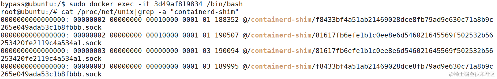在容器内执行 cat /proc/net/unix|grep -a "containerd-shim" 可看到抽象命名空间Unix域套接字.