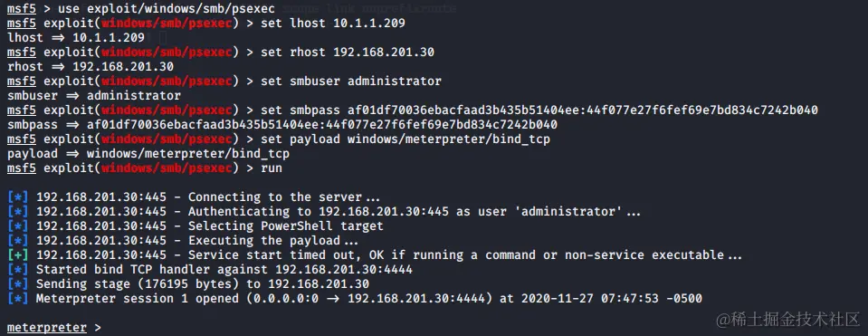 MSF 提供了psexec模块可以进行Hash传递,只使用密码哈希,来执行任意命令: