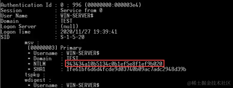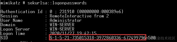 通过mimikatz命令直接获取krbtgt的SID值和哈希值。
