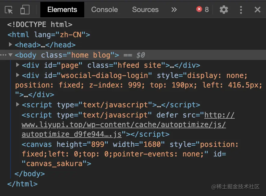 当我们在浏览器里查看网站源码( ctrl + u )或按F12打开开发者工具,首先看见的是网站的HTML源代码: