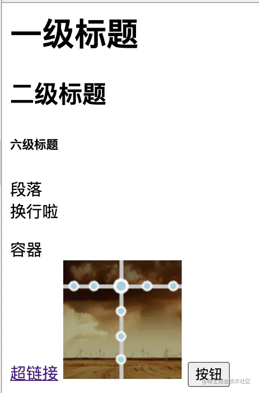 <html> <head> ... </head> <body> <h1>一级标题</h1> <!-- heading的缩写,h1-h6对应一至六级标题,加粗显示,字号依次缩小 --> <h2>二级标题</h2> <h6>六级标题</h6> <p>段落<br/>换行啦</p> <!-- paragraph的缩写,表示一段文章 --> <!-- br表示换行 --> <div>容器</div> <!-- 最重要的标签,几乎可嵌套任何内容,代替其他任何标签 --> <a href="https://www.baidu.com">超链接</a> <!-- 超链接,点击后跳转 --> <img src="https://t.cn/RCzsdCq"/> <!-- image的缩写,显示图像 --> <button>按钮</button> </body> </html>其中,