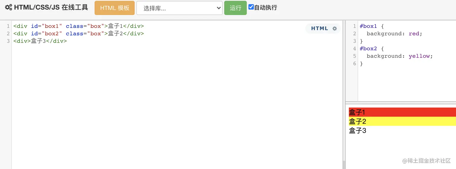 #id值 { ... }可以将下面css代码应用到上述html内容中,给两个盒子不同的背景颜色: