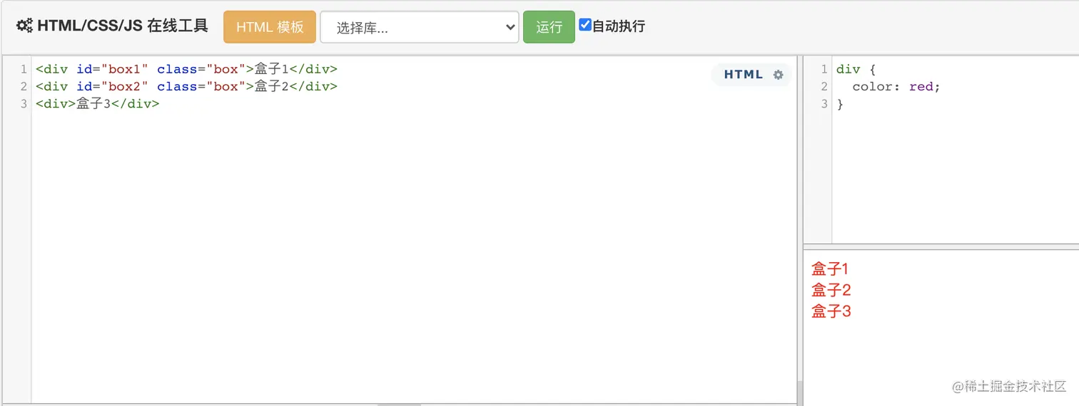 标签名 { ... }可以将下面css代码应用到上述html内容中,改变所有div标签的字体颜色: