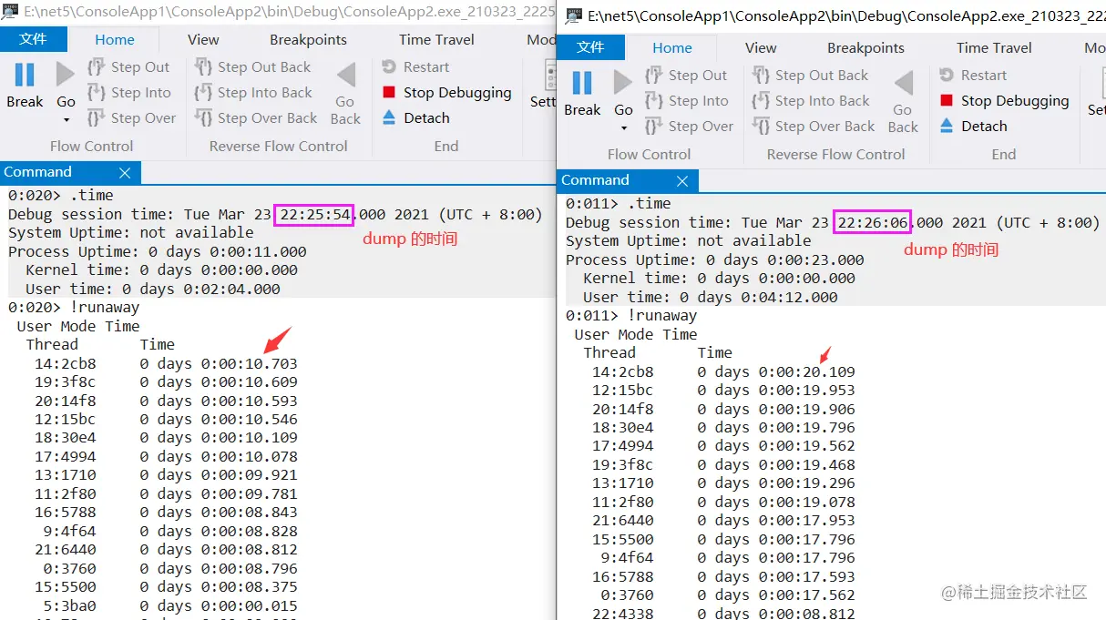 现在 dump 有了,接下来用两个 windbg 实例打开,验证下 dump 的生成时间,如下图所示: