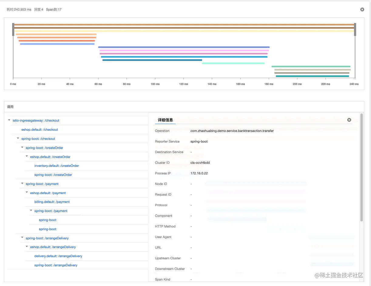 Istio/Envoy为微服务提供了开箱即用的分布式调用跟踪功能。在安装了Istio和Envoy的微服务系统中,Envoy会拦截服务的入向和出向请求,为微服务的每个调用请求自动生成调用跟踪数据。通过在服务网格中接入一个分布式跟踪的后端系统,例如zipkin或者Jaeger,就可以查看一个分布式请求的详细内容,例如该请求经过了哪些服务,调用了哪个REST接口,每个REST接口所花费的时间等。