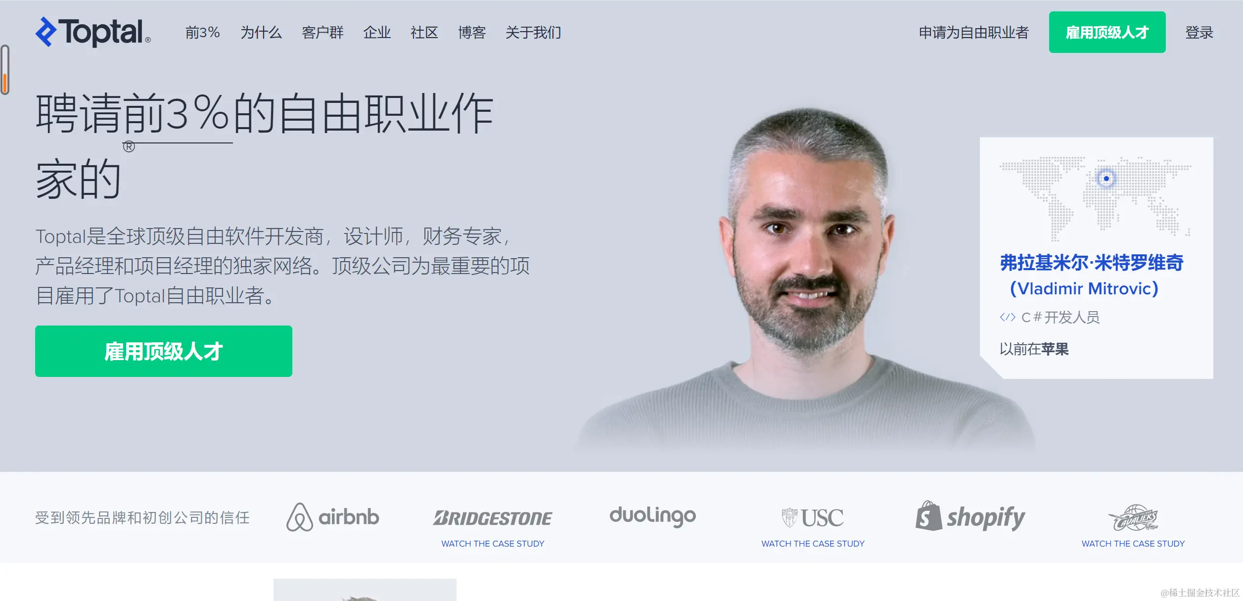 Toptal 是一个高端一些的自由职业者平台,适合比较有经验和工作尽力的远程工作者。它将企业与全球的软件工程师,设计师和业务顾问联系起来。