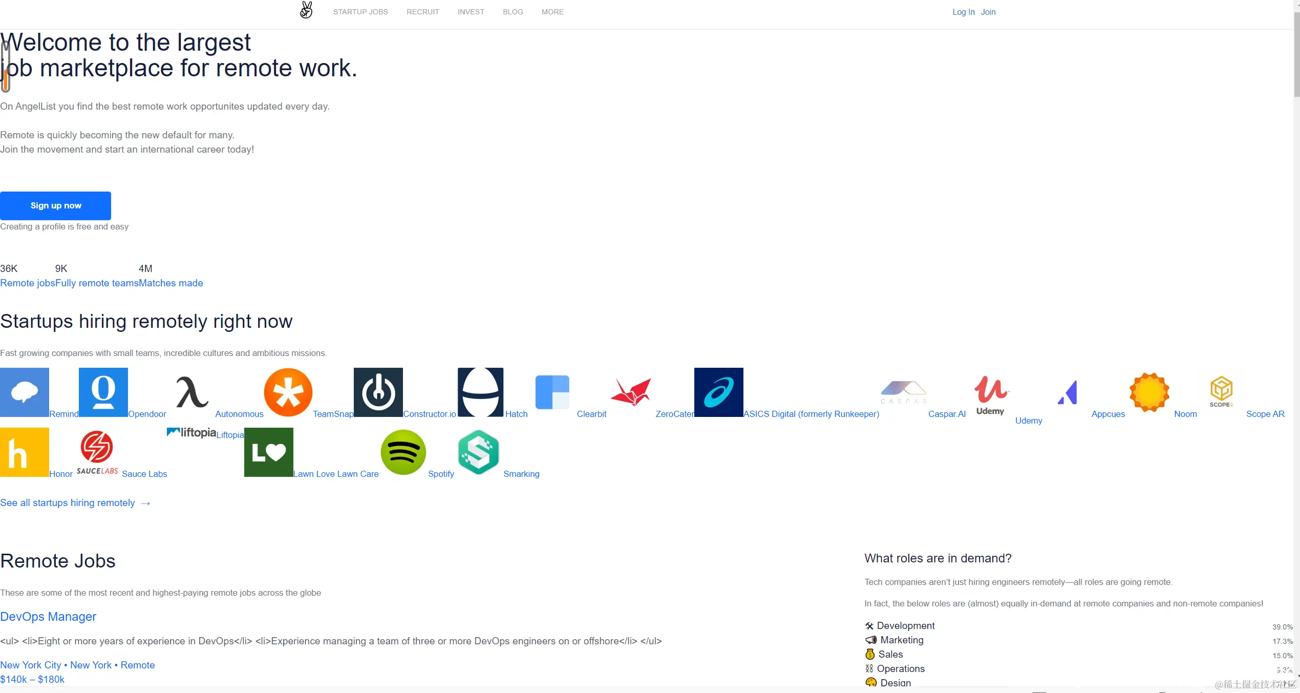 AngelList 主要是服务于初创公司和天使投资人的平台,这里还有初创公司提供的远程工作的机会,如果对远程加入初创公司感兴趣的,可以尝试一下。