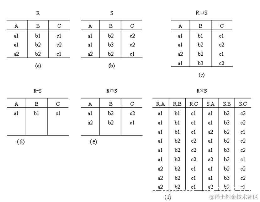 (2)差(-):在关系R中减去S有的行,保留的是S中没有的行。运算的时候依次将两个表的一行一行相减。