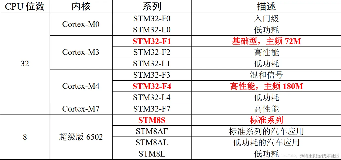 表格1 STM8和STM32分类