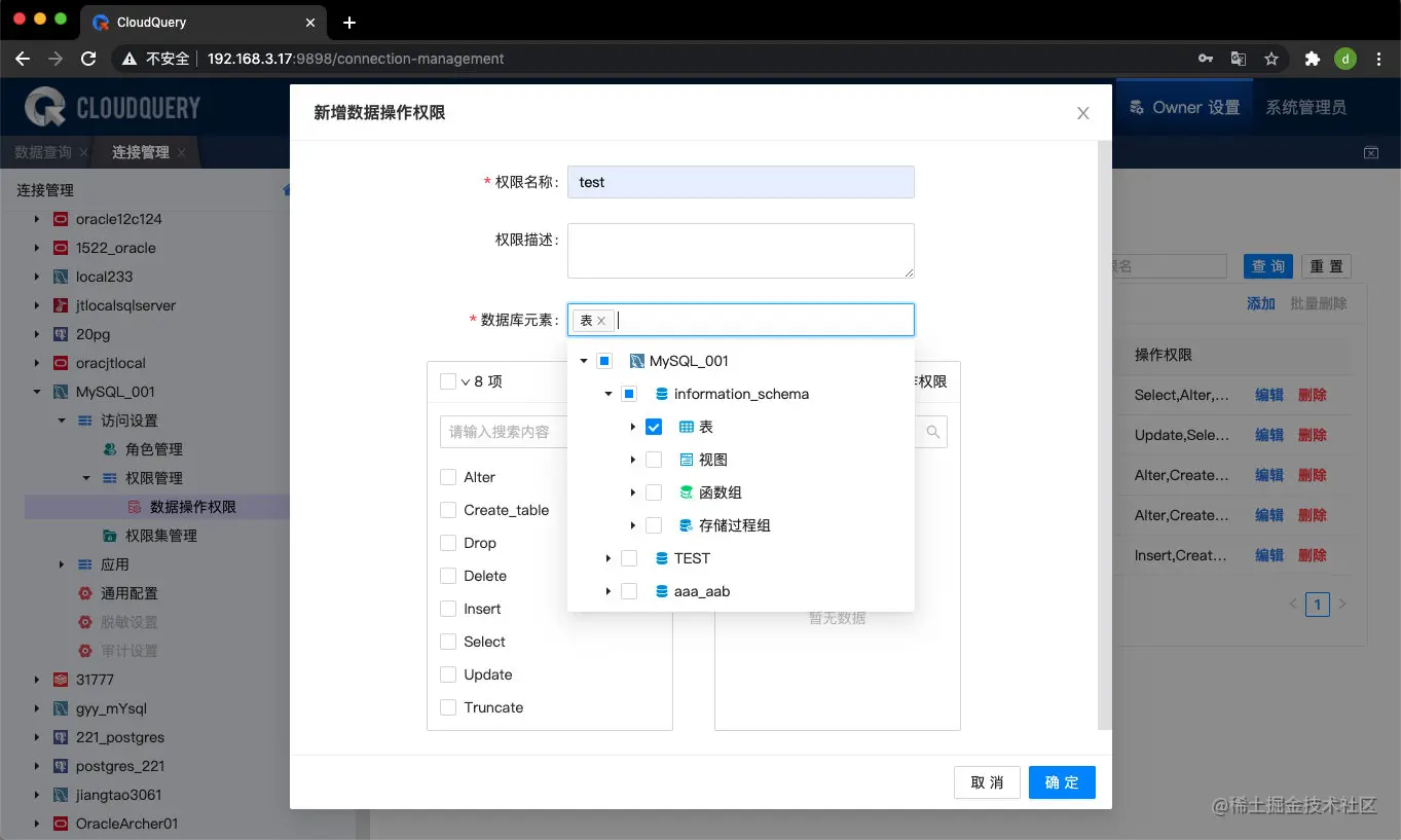 除了组织架构外, 另一个亮点就是数据操作权限。我们都知道,数据风险的大部分原因都是因为权限控制不当导致的,例如之前的微盟事件、链家事件等等,那么详细可控的数据操作权限就成了极其重要的环节,这一点也是在研发 CloudQuery 时着重考虑的。