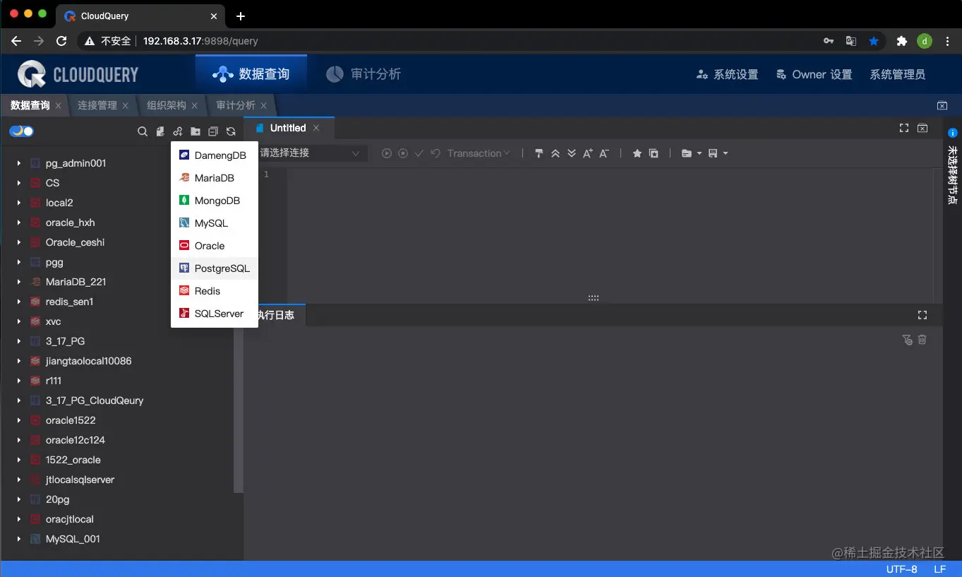 以查询数据库来讲,CloudQuery 已支持了 8 类常见的数据源:Oracle、MySQL、PostgreSQL、MongoDB、MariaDB、Redis、SQLServer、达梦数据库。(现在数据源正在迅速增加中,未来半年左右,CloudQuery 将再增加十余种常用的数据源,包含国产数据源)现在就不需要再打开各种工具进行数据查询了,直接用浏览器登录就可以查询,非常方便。