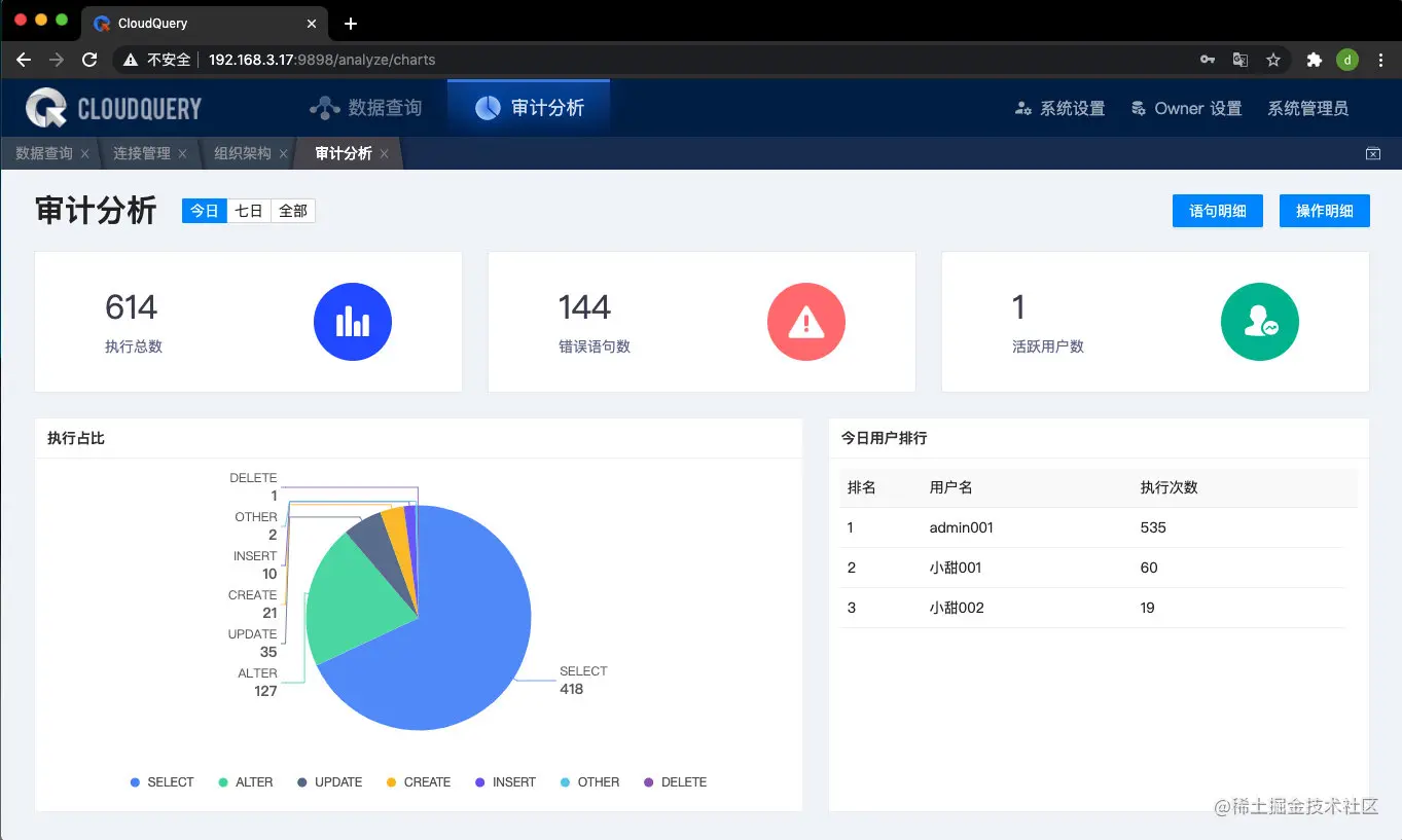 CloudQuery 审计系统可以审计到所有用户的在系统内执行的所有语句和操作,并可查看所有用户所执行的详细的语句明细和操作明细。例如你可以查看用户小明在 4 月 10 日 15:30:40 在哪个连接的哪个数据库中执行了一条什么语句,并查看他的 IP 地址、执行结果和耗时情况等,保证一切数据均有据可循。