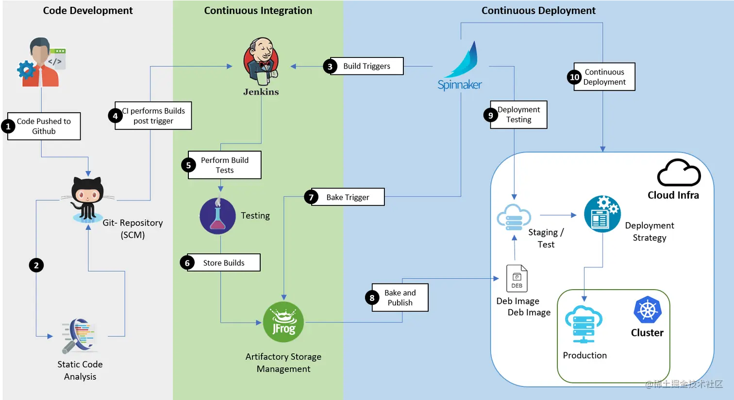 Spinnaker将自动将烘焙的映像传递到部署阶段。这是将服务器组设置为部署到集群的位置。与上述测试过程类似,在部署阶段执行功能相同的过程。部署首先转移到测试、阶段,最后转移到生产环境,然后进行批准和检查。整个过程由Spinnaker之类的工具处理。