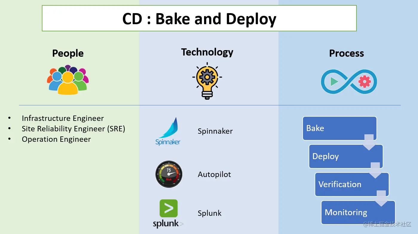 过程:测试阶段完成后,清除了标准的代码就可以部署到服务器中,在那里它们将与主应用程序集成。在部署到生产环境之前,它们将被部署到产品团队内部使用的测试/暂存或beta环境中。在将构建移动到这些环境之前,构建必须经过两个子阶段Bake和Deploy。这两个阶段都是Spinnaker固有的。